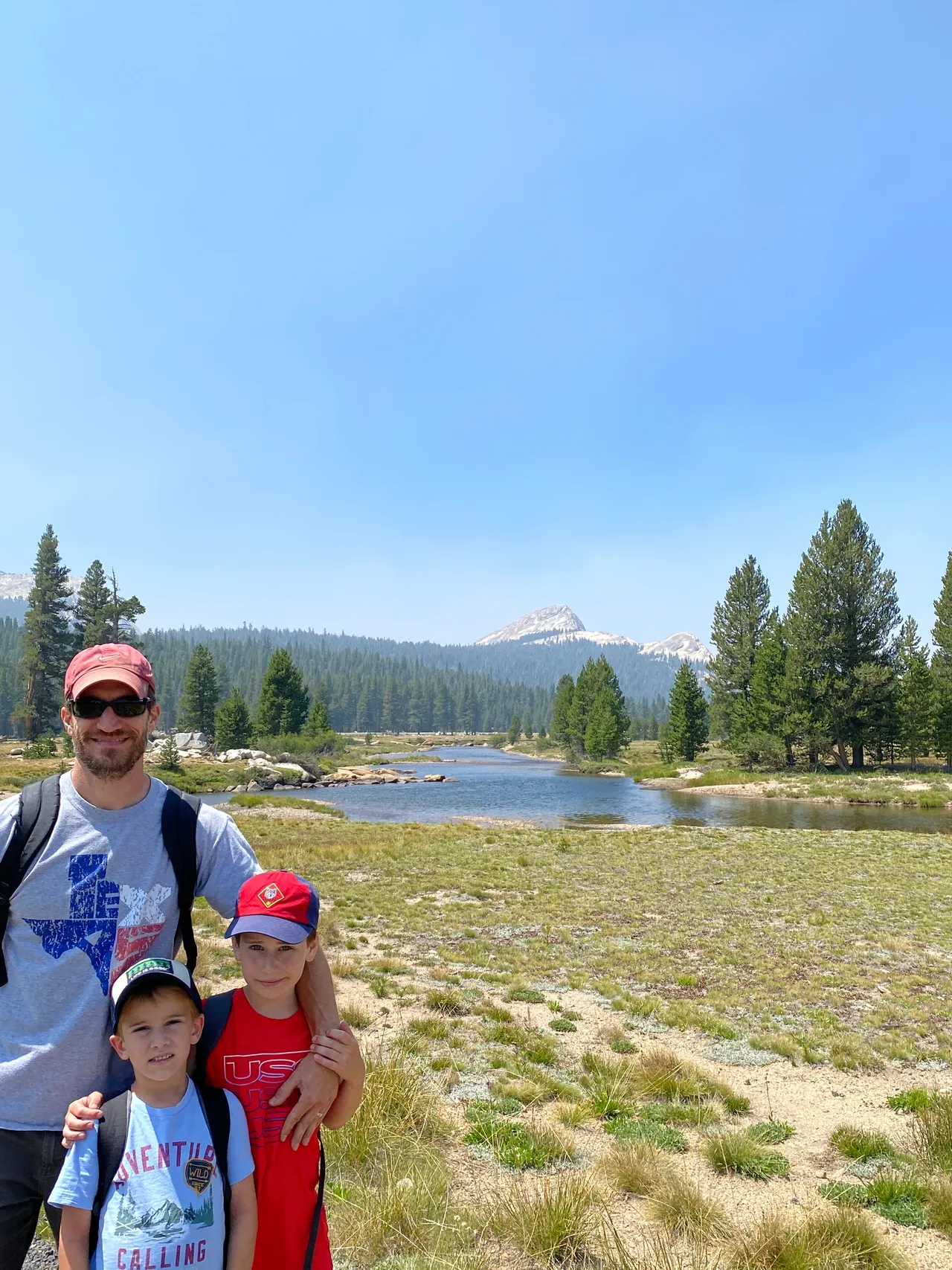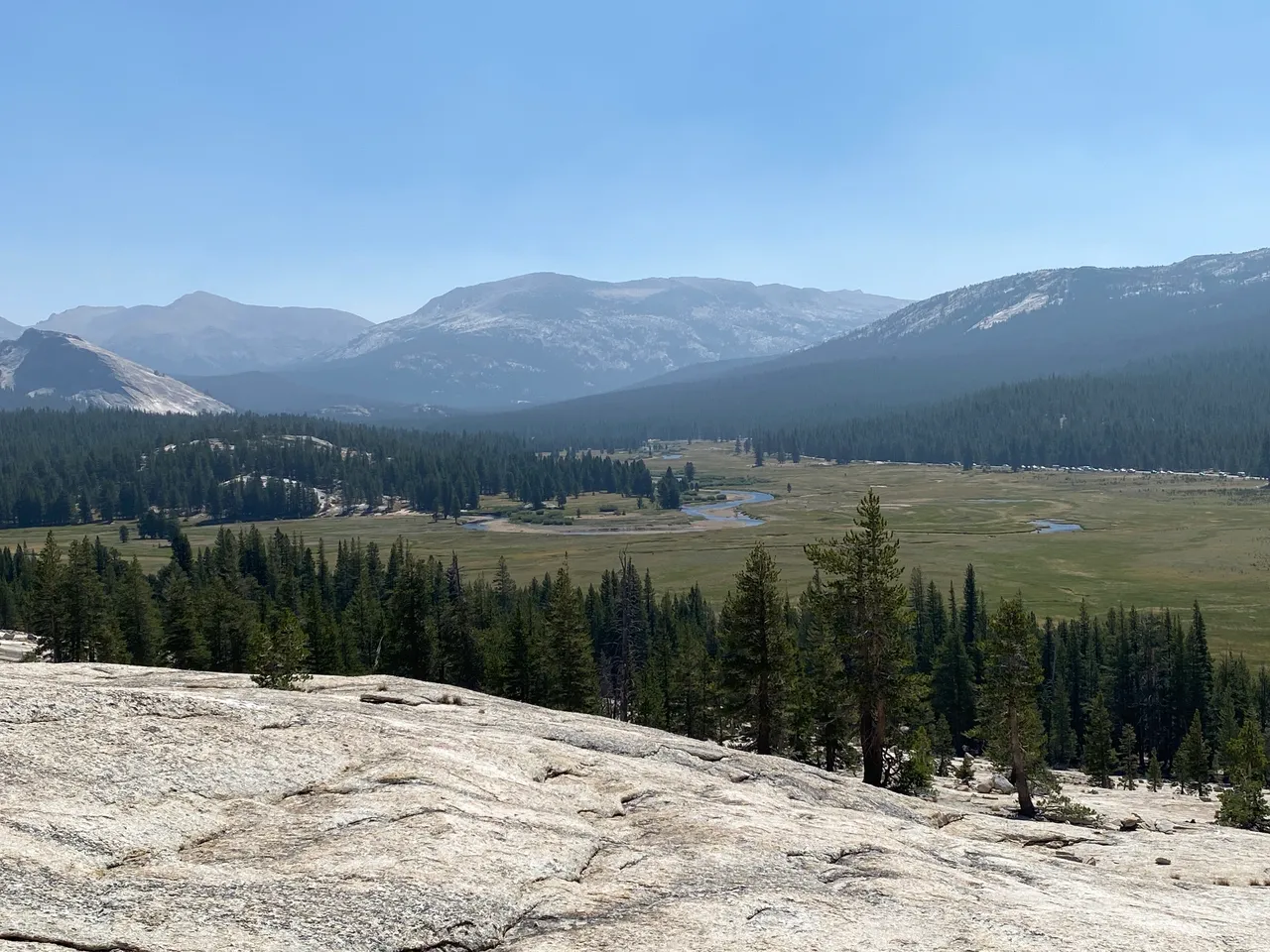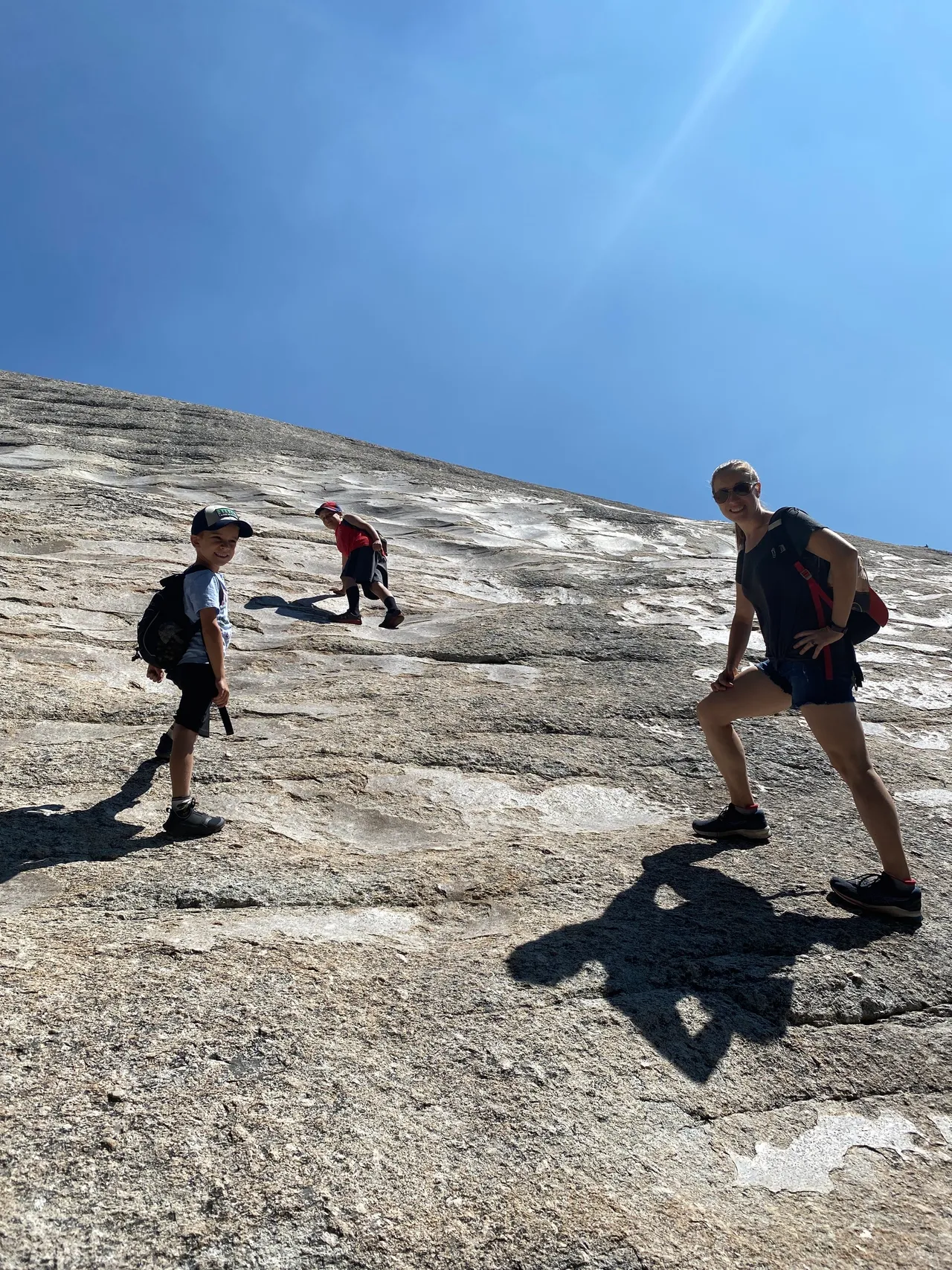 DAY 4: On our fourth day in Yosemite (Day 8, overall), my parents and our family of four drove the hour and a half from our hotel to Tuolomne (Tu-AH-lo-me) Meadows. This section of the park is quite different from the valley in terms of flora, fauna, and climate. The temperature here in the summer is about 18 degrees cooler than the valley. We were told to wear pants and jackets but didn’t quite believe it until we actually got out there. Being such a flat, open space also allowed the wind to whip through as well. James and I and our two boys hiked up Pothole Dome, which proved to be quite an adventure as we accidentally went up the steeper side of the dome than we were supposed to. Lesson learned!